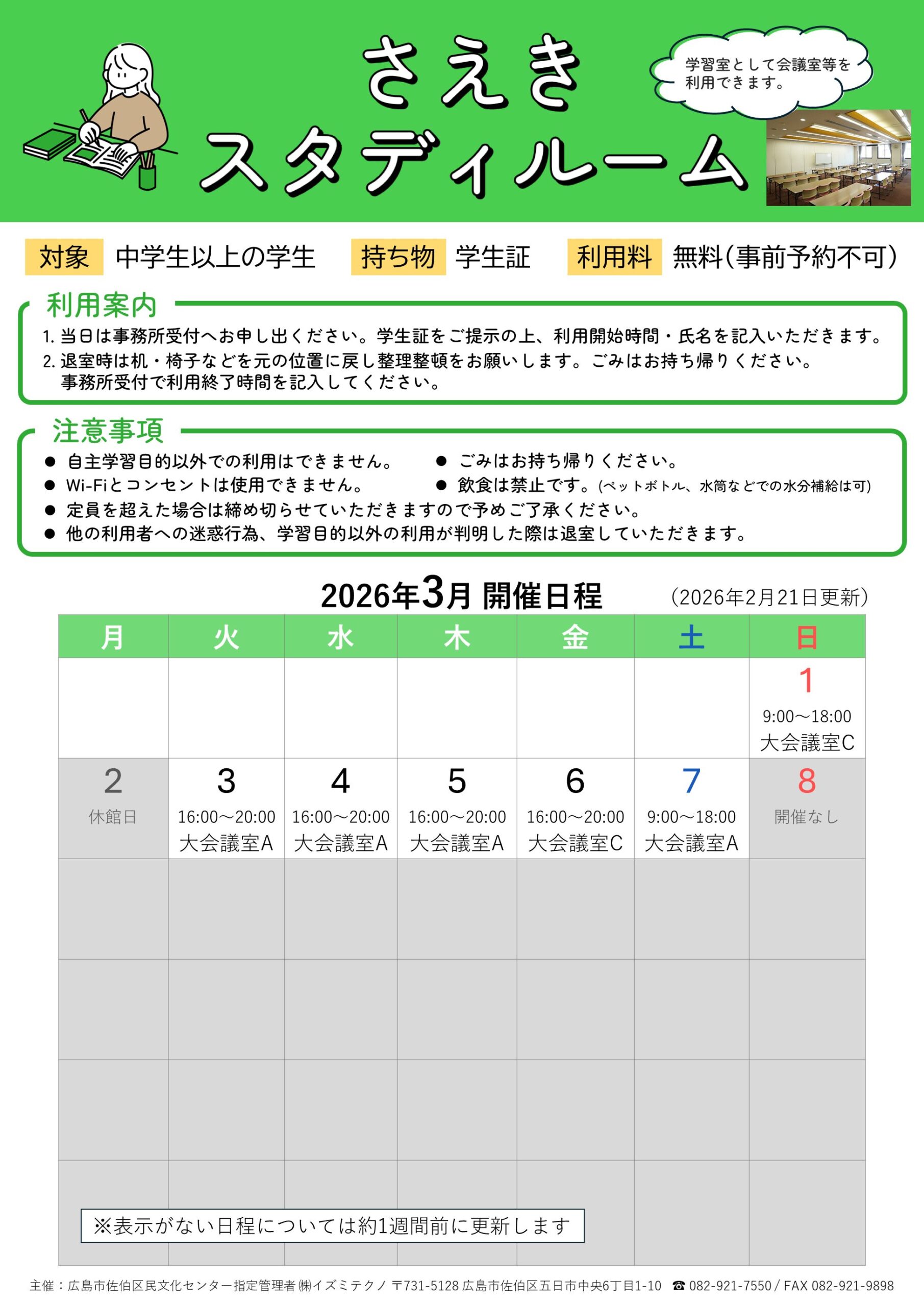 自主学習スペースとして利用できる「さえきスタディルーム」を開催します。
