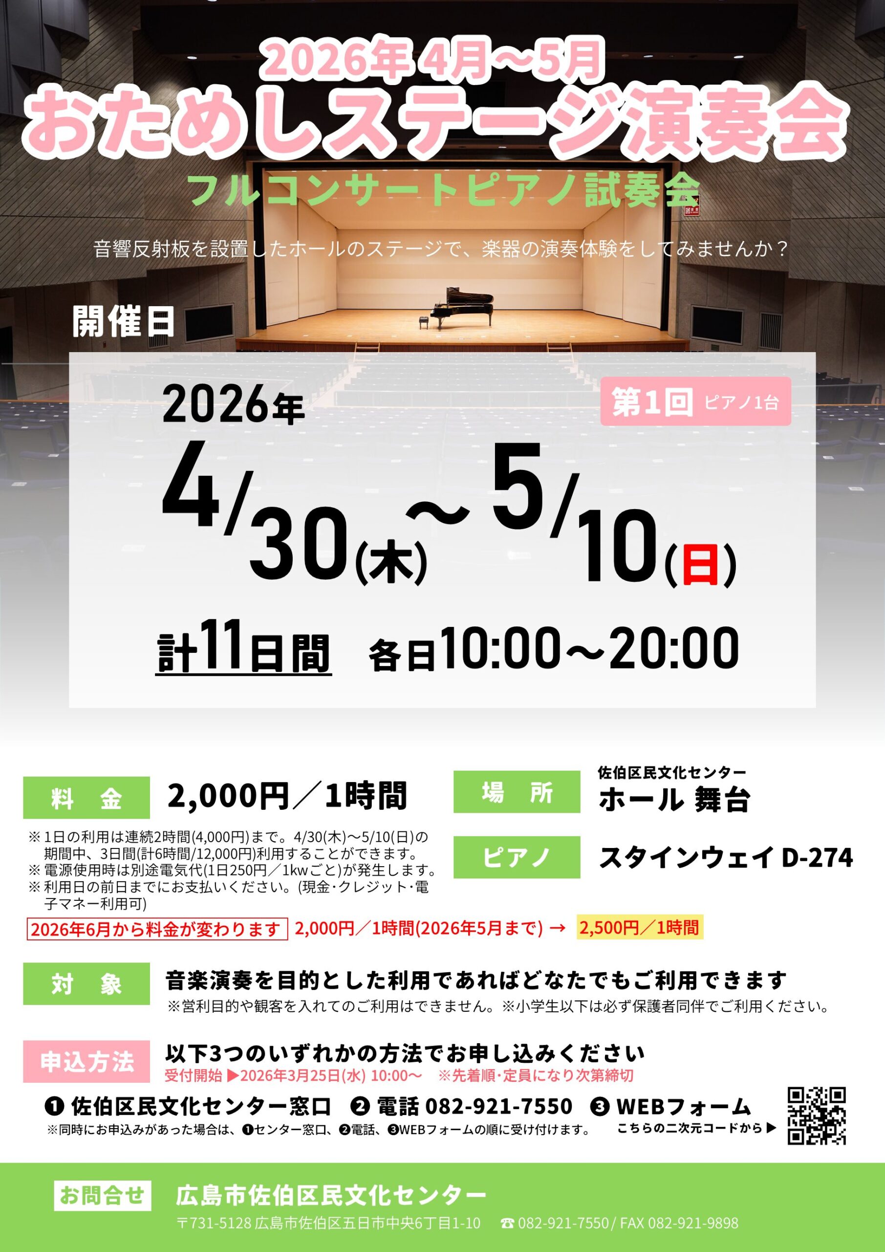 申込方法 | ①佐伯区民文化センター窓口 ②電話(佐伯区民文化センター:082-921-7550) ③WEBフォーム 以下のフォームからお申し込みください。 |