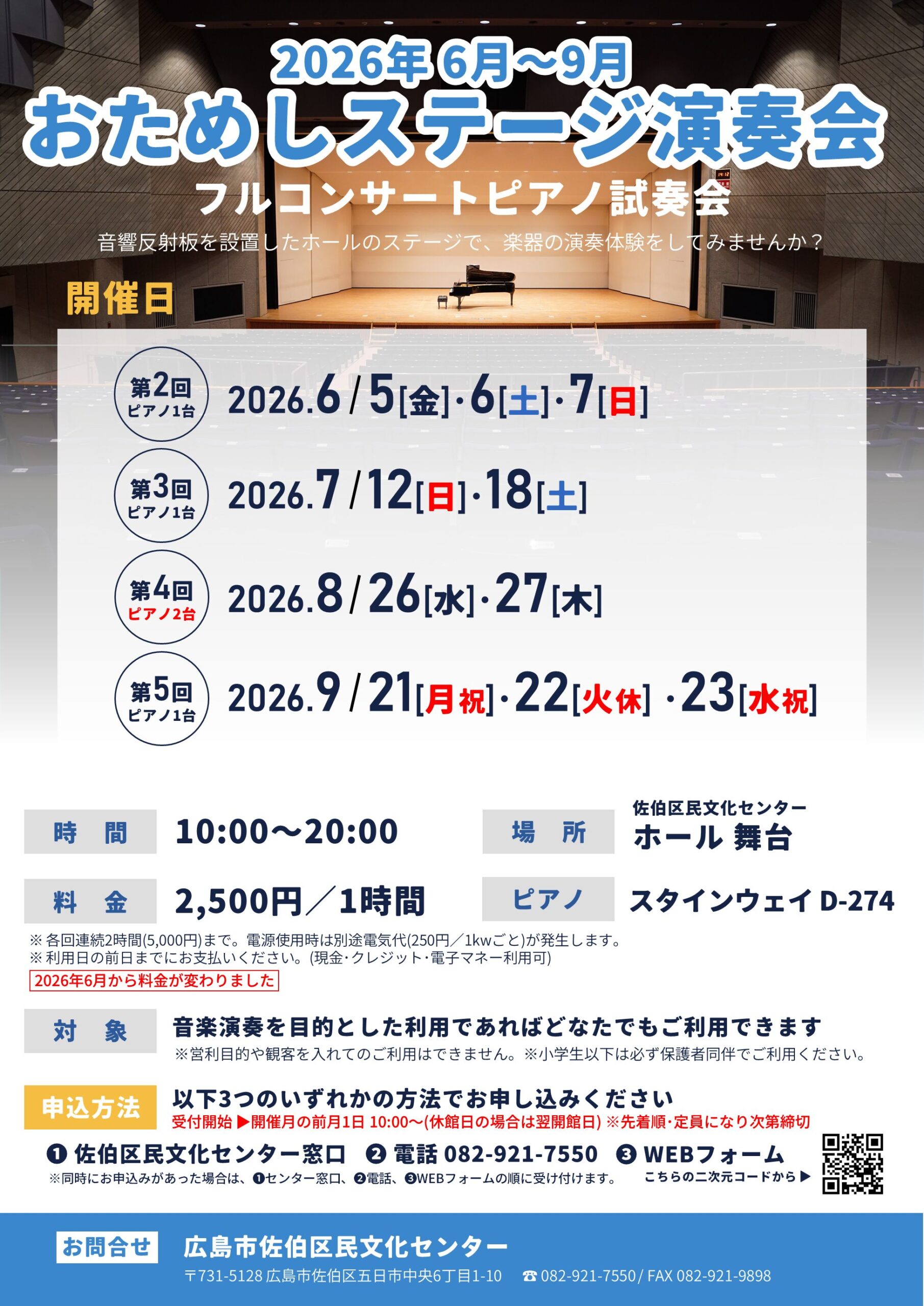 申込方法 | ①佐伯区民文化センター窓口 ②電話(佐伯区民文化センター:082-921-7550) ③WEBフォーム 以下のフォームからお申し込みください。 | |