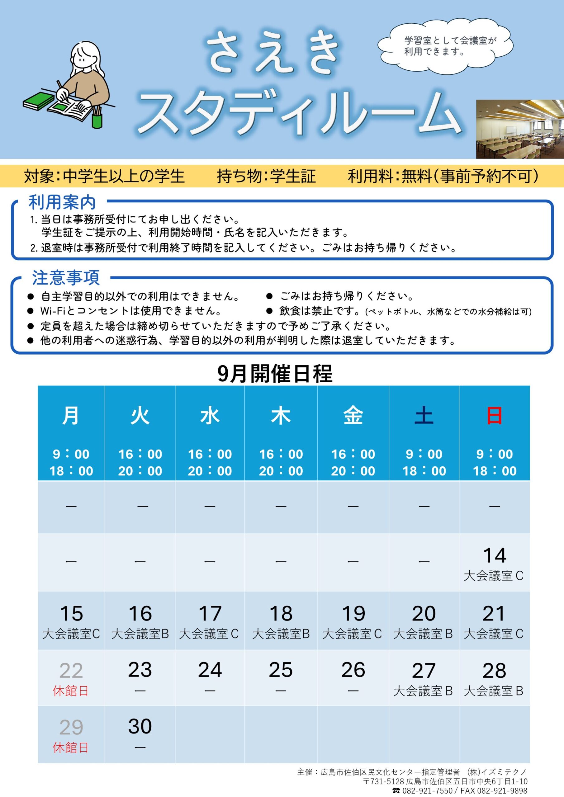 2025年9月より、自主学習スペースとして会議室を利用できる「さえきスタディルーム」を開催します。
